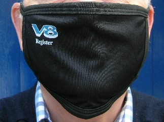 A limited supply of face masks with a modest V8 Register logo is now